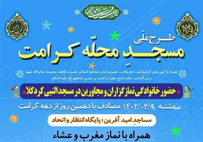 زرگري گفت: کانون فرهنگي هنري قمر بني هاشم مسجد النبي جويبار مصادف با دهمين روز دهه کرامت ميزبان مجاورين مسجد در راستاي اجراي طرح ملي «مسجد محله کرامت» با اقامه نماز جماعت مغرب و عشا، سخنراني و مداحي است.