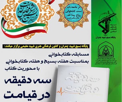 مسابقه کتابخواني به مناسبت هفته کتاب و هفته بسيج از کتاب «سه دقيقه در قيامت» به همت کانون فرهنگي هنري شهيد سيد حسين مقيمي مسجد صاحب الزمان بابل برگزار مي‌شود.