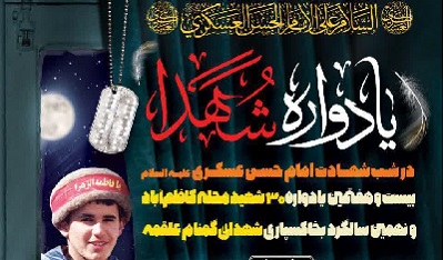 بيست و هفتمين يادواره شهداي محله کاظمآباد و نهمين سالگرد به خاکسپاري دلاورمردان گمنام علقمه در شب شهادت امام حسن عسکري(ع) با حضور اعضاي کانون هاي فرهنگي هنري مساجد استان مازندران برگزار ميشود.